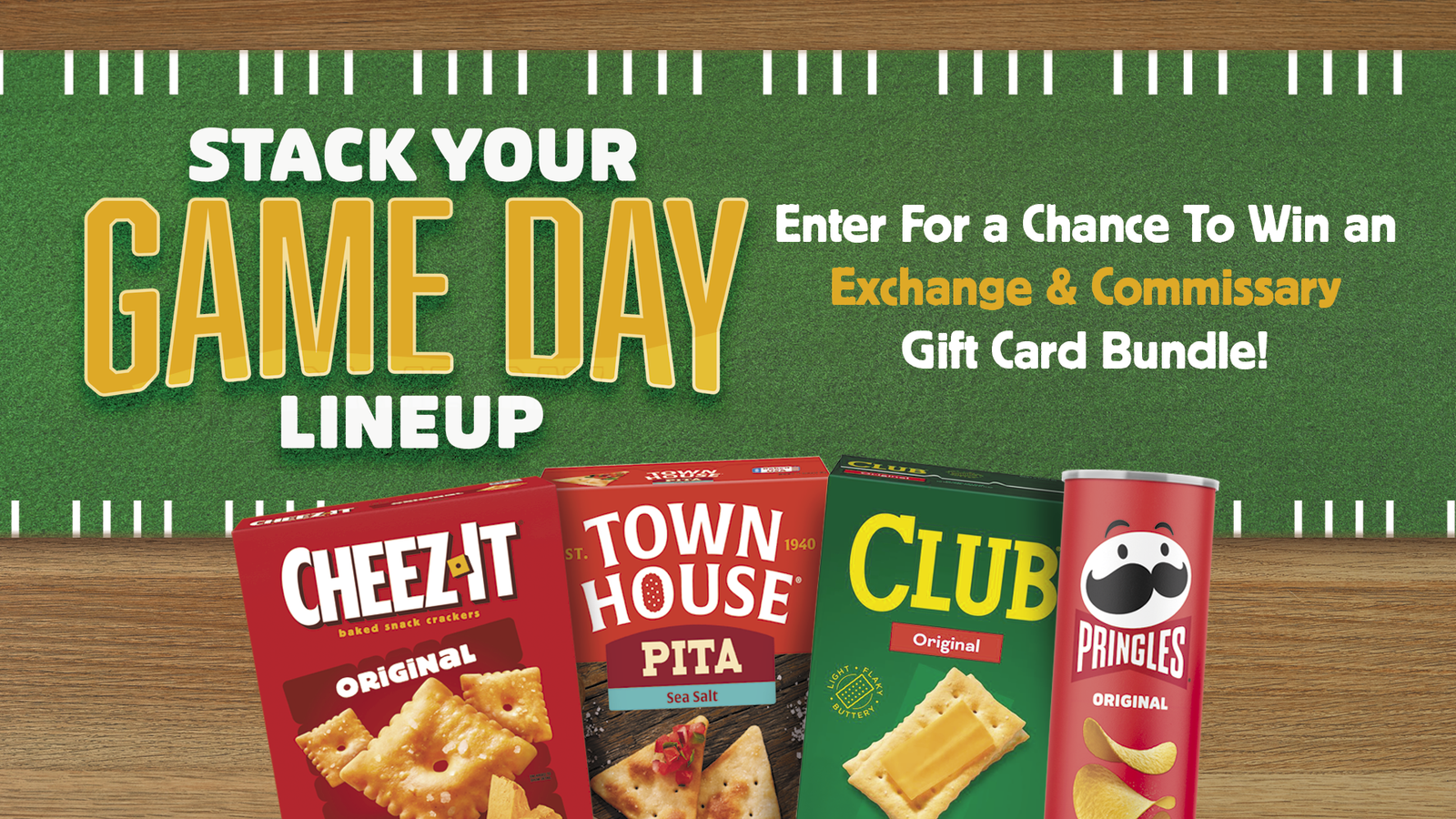 Earn additional entries by purchasing participating Cheez-It®, Pringles®, Club® or Town House® products at participating Commissary or AAFES Exchange stores and uploading a valid receipt. Limit 5 entries per person/email. Winners selected by random drawing. Odds depend on number of entries. Prizes include Commissary and Exchange gift cards.