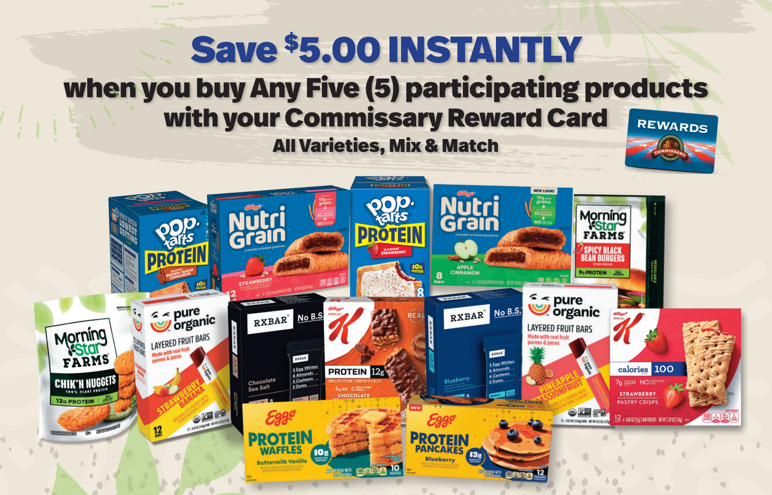 Must purchase any five (5) participating products with your Commissary Reward Card. All varieties, Mix & Match.